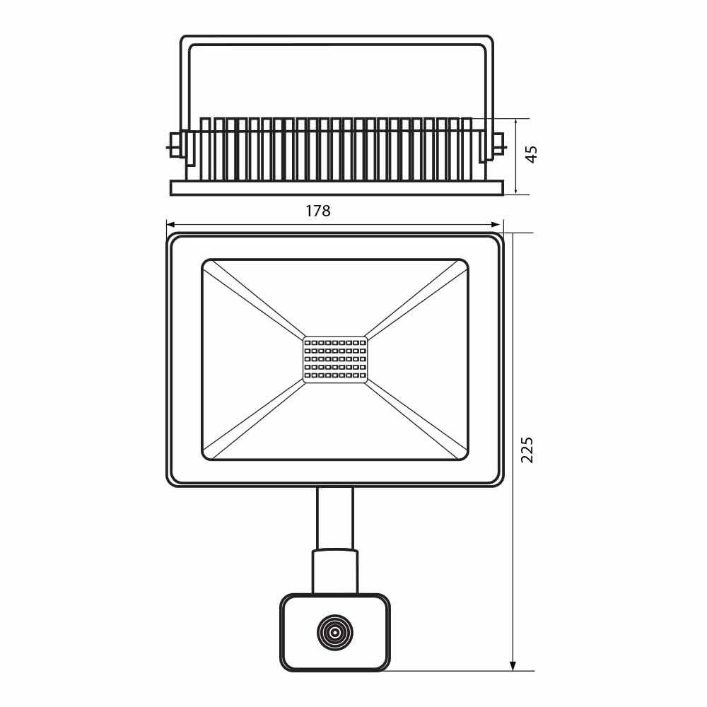 LED-es reflektor; 50W; 4000lm; 6400K (nappali); 230V; 120°; IP44; 210x254x25mm; felületi szerelés; 25000h; fekete; LED fényforrás; nem szabályozható; alumínium; -20÷+35°C