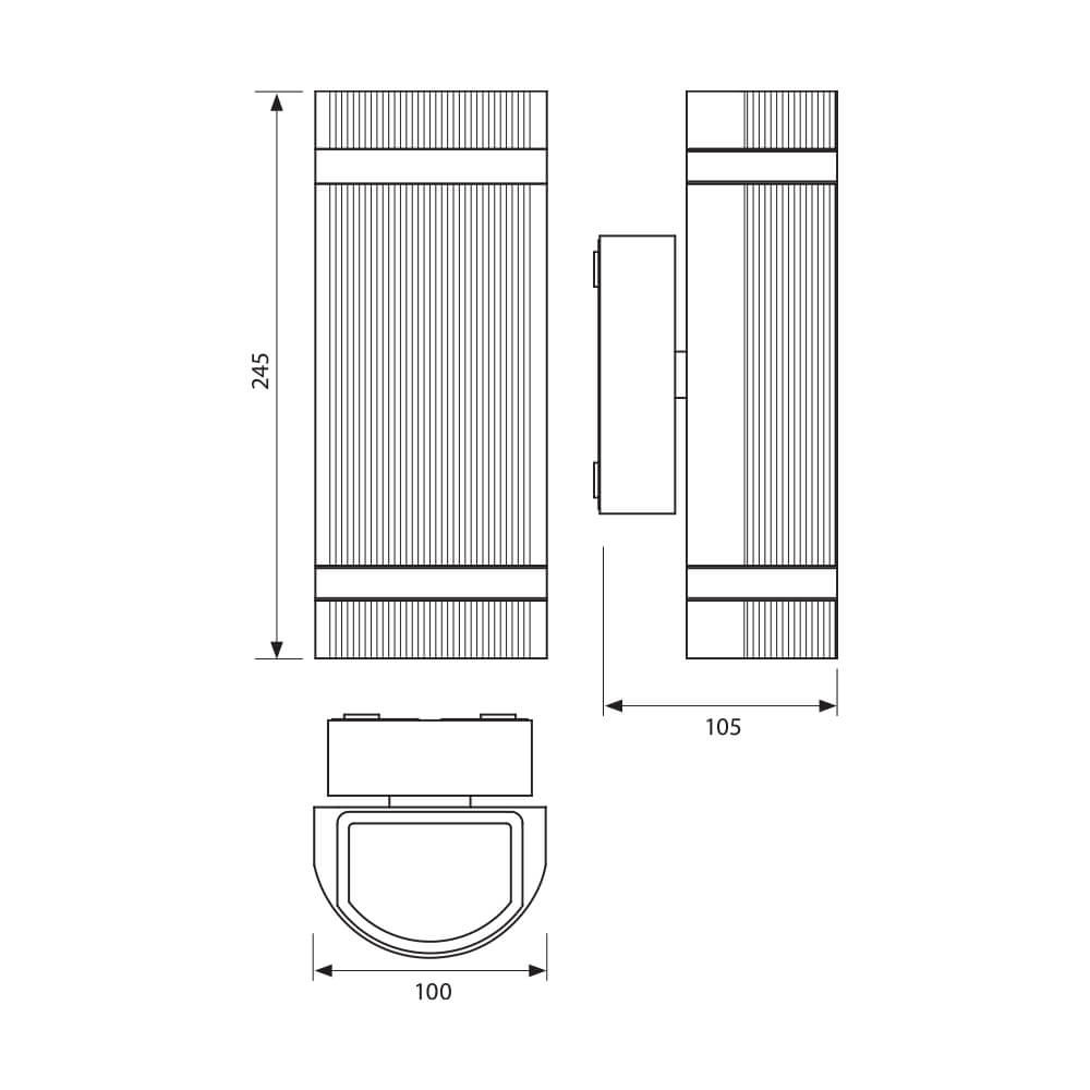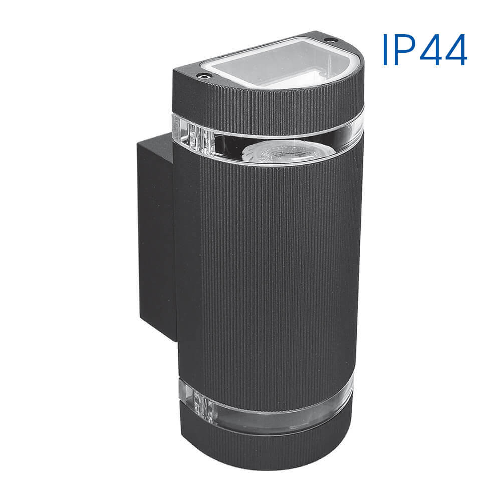 Homlokzati szerelvények; 230V; GU10; IP44; 100x245x105mm; felületi szerelés; max 2x35W; fekete; nem tartalmaz fényforrást; alumínium